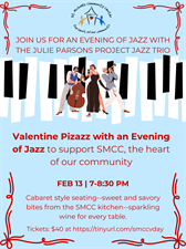 Join us for an evening of jazz with the Julie Parsons Project Jazz Trio at the St. Michaels Community Center where you will enjoy cabaret-style seating with sweet & savory bites and a bottle of prosecco on each table. All proceeds support SMCC's programming, including the food distribution program.